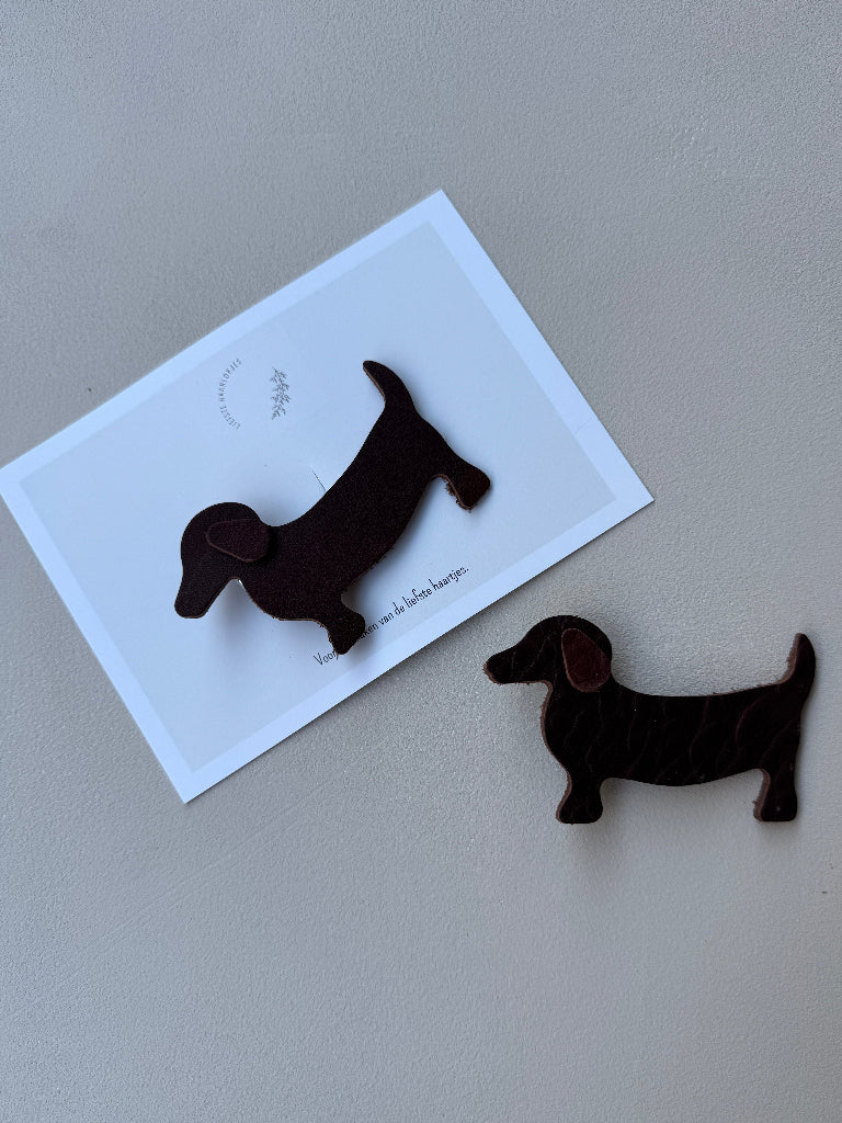 Deze schattige leren teckel clip is het perfecte accessoire voor kleine dierenliefhebbers. Handgemaakt met echt leer door Liefste Haarlokjes en alleen bij ons verkrijgbaar – een uniek item dat je nergens anders vindt!