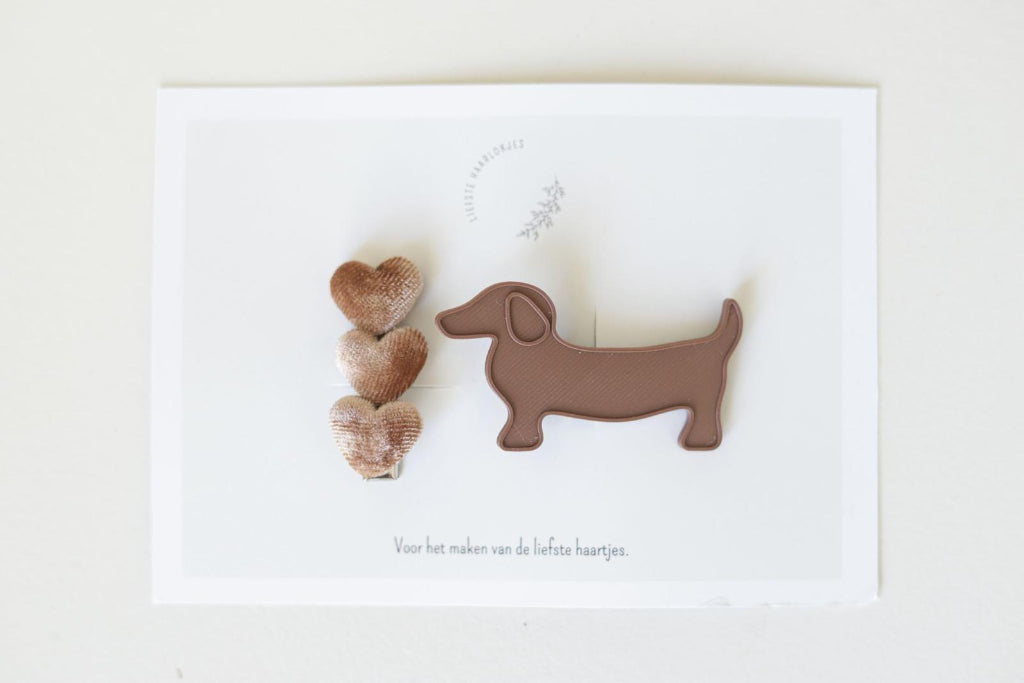 Deze schattige teckel clip is het perfecte accessoire voor kleine dierenliefhebbers. Handgemaakt door Liefste Haarlokjes en alleen bij ons verkrijgbaar – een uniek item dat je nergens anders vindt!
