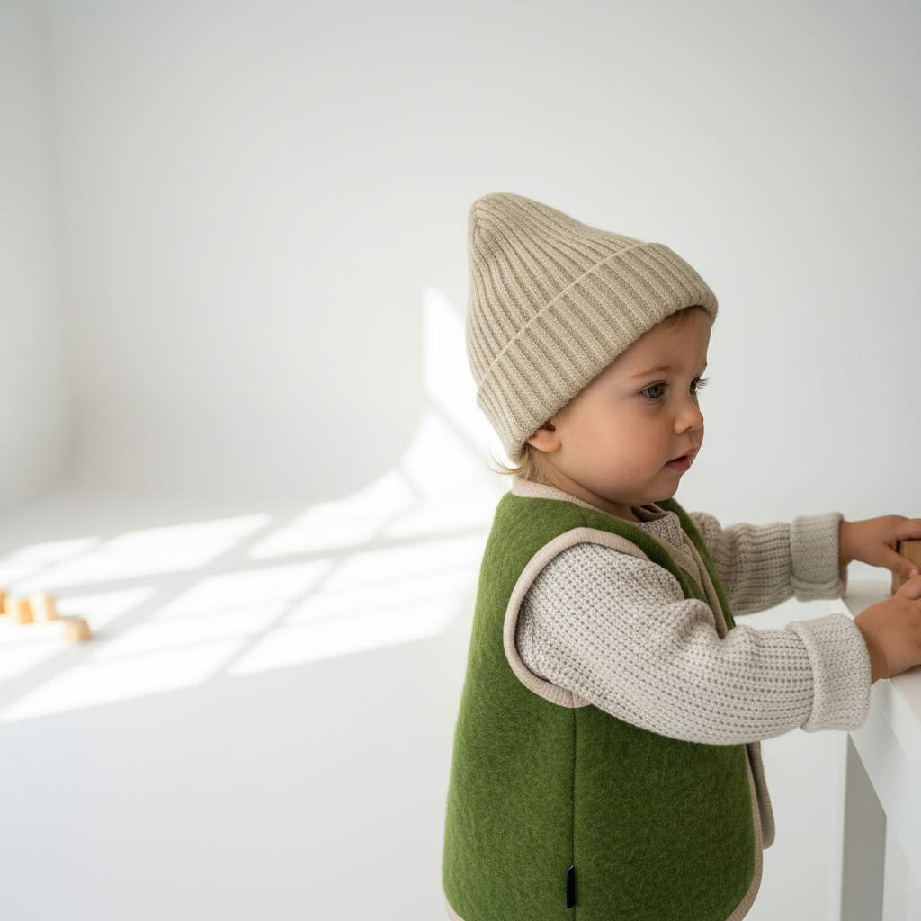 Het gilet is met liefde gemaakt op room to grow basis. Warm én ademend, perfect voor alle seizoenen. De natuurlijke wol reguleert de temperatuur, waardoor je kindje comfortabel blijft; thuis, buiten of onderweg. De handgesneden knoop van appeltakken uit de Krimpenerwaard voegt een puur, ambachtelijk detail toe en maakt elk gilet extra bijzonder.