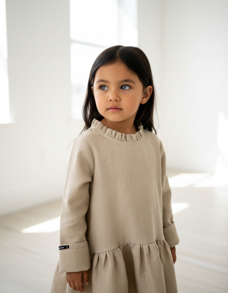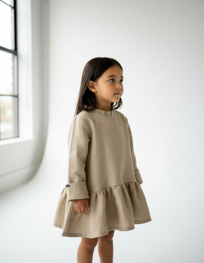 Heel veel volume zacht linnen danst om je dochter heen. Een jurk om jaren mee te doen, want je draagt deze makkelijk door, totdat het een blouse is qua lengte. Door onze speciale toegepaste 'room to grow' patroon techniek, start je met omgeslagen mouwen en wikkel deze af als ze groeit.