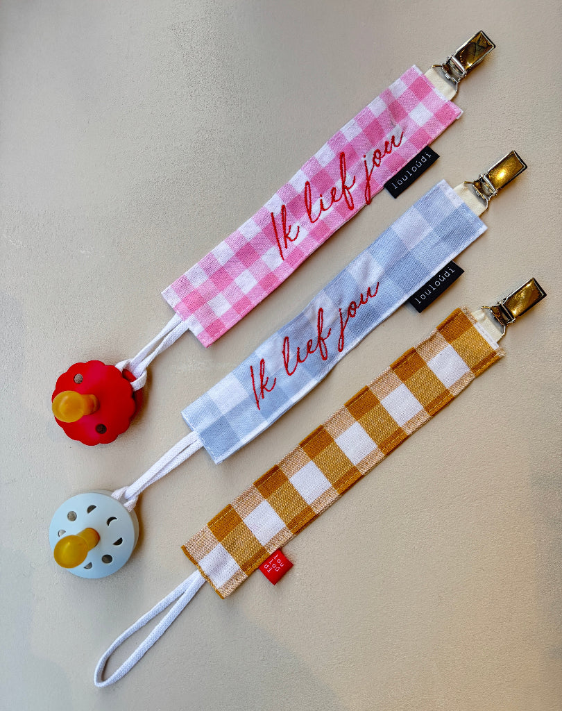 Je kunt het speenkoord (behalve de leren varianten) ook laten personaliseren met de naam van je kindje, of een andere korte lieve tekst, zoals 'ik lief jou'. Selecteer hiervoor de optie Ja bij personaliseren en geef de tekst op in het commentaarveld. Geef daar ook de gewenste kleur borduurgaren op.