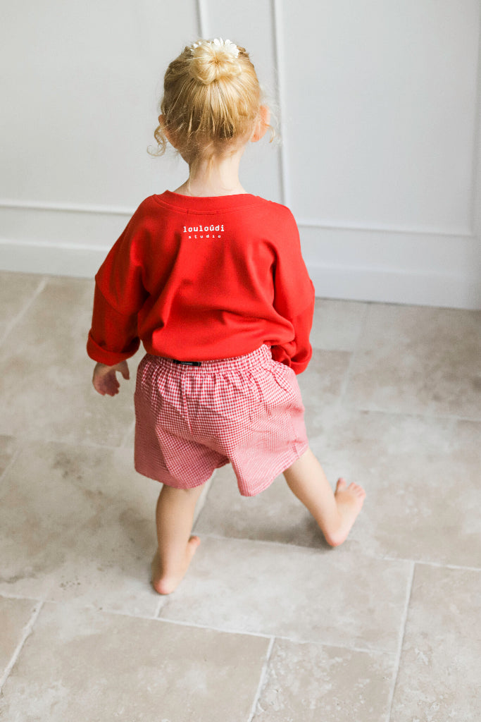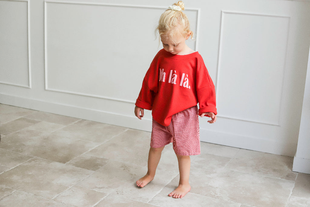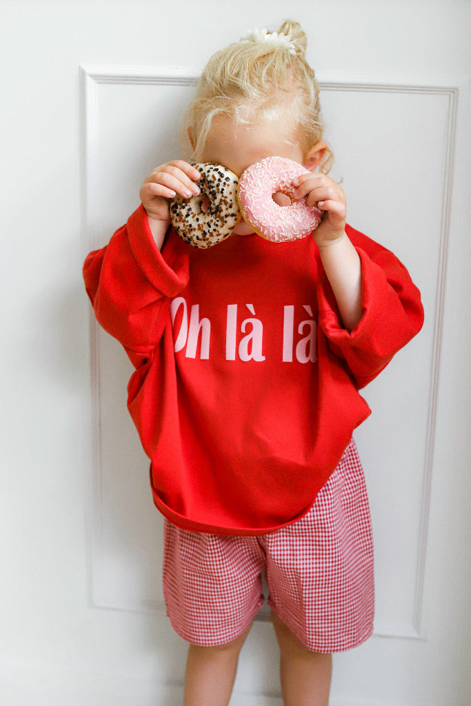 Geef de outfit van je kleintje een vleugje Parijse flair met het rode oversized T-shirt met Oh là là print van louloúdi. Gemaakt van zacht biologisch katoen en ontworpen om zowel stijlvol als comfortabel te zijn. De speelse print en de relaxte fit maken dit shirt perfect voor avontuurlijke dagen en cozy momenten thuis.